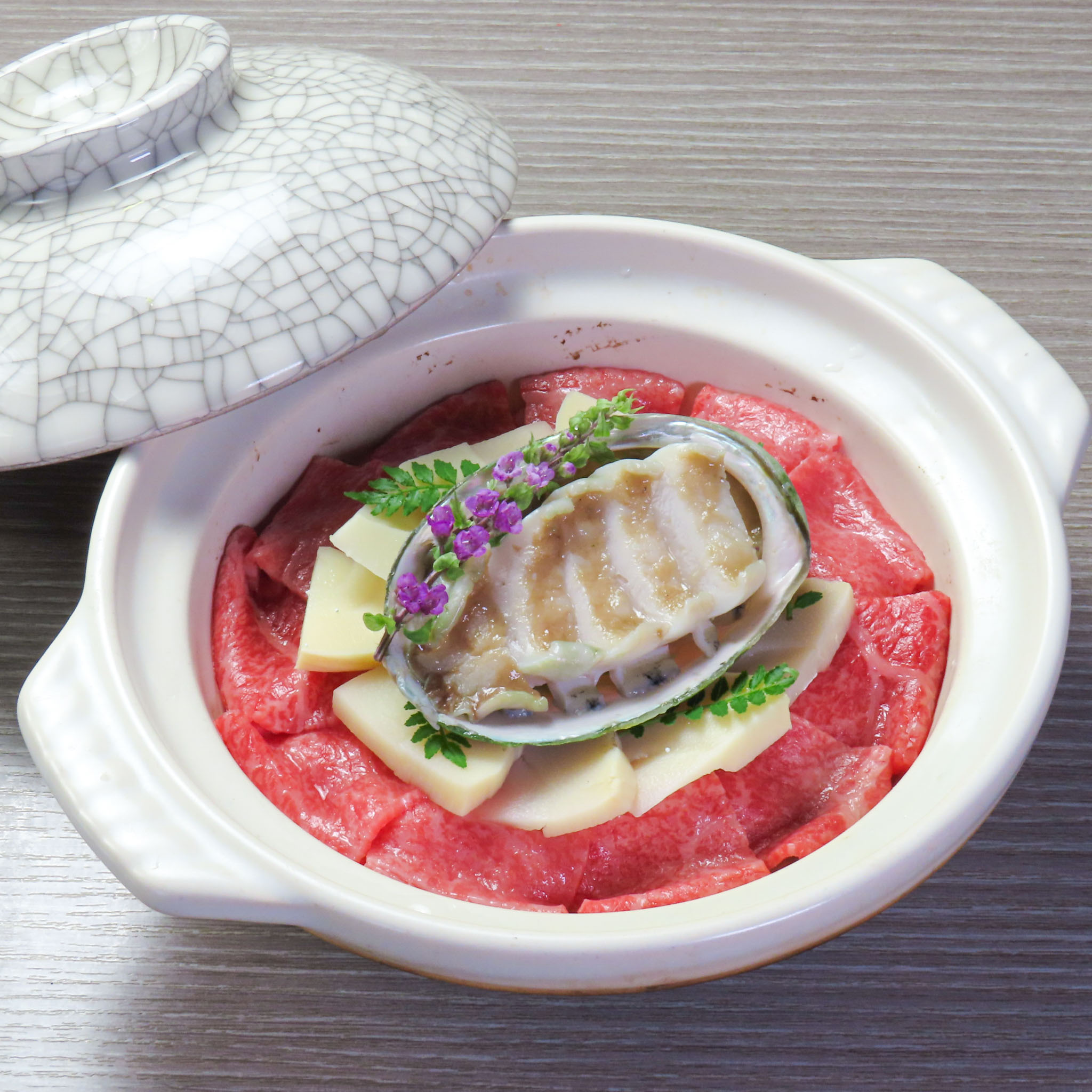 鮑の芳醇で上品な香りとシャキシャキの筍の食感を楽しめる逸品。丁寧に仕上げられた肝出汁と和牛の旨味が春を彩ります。