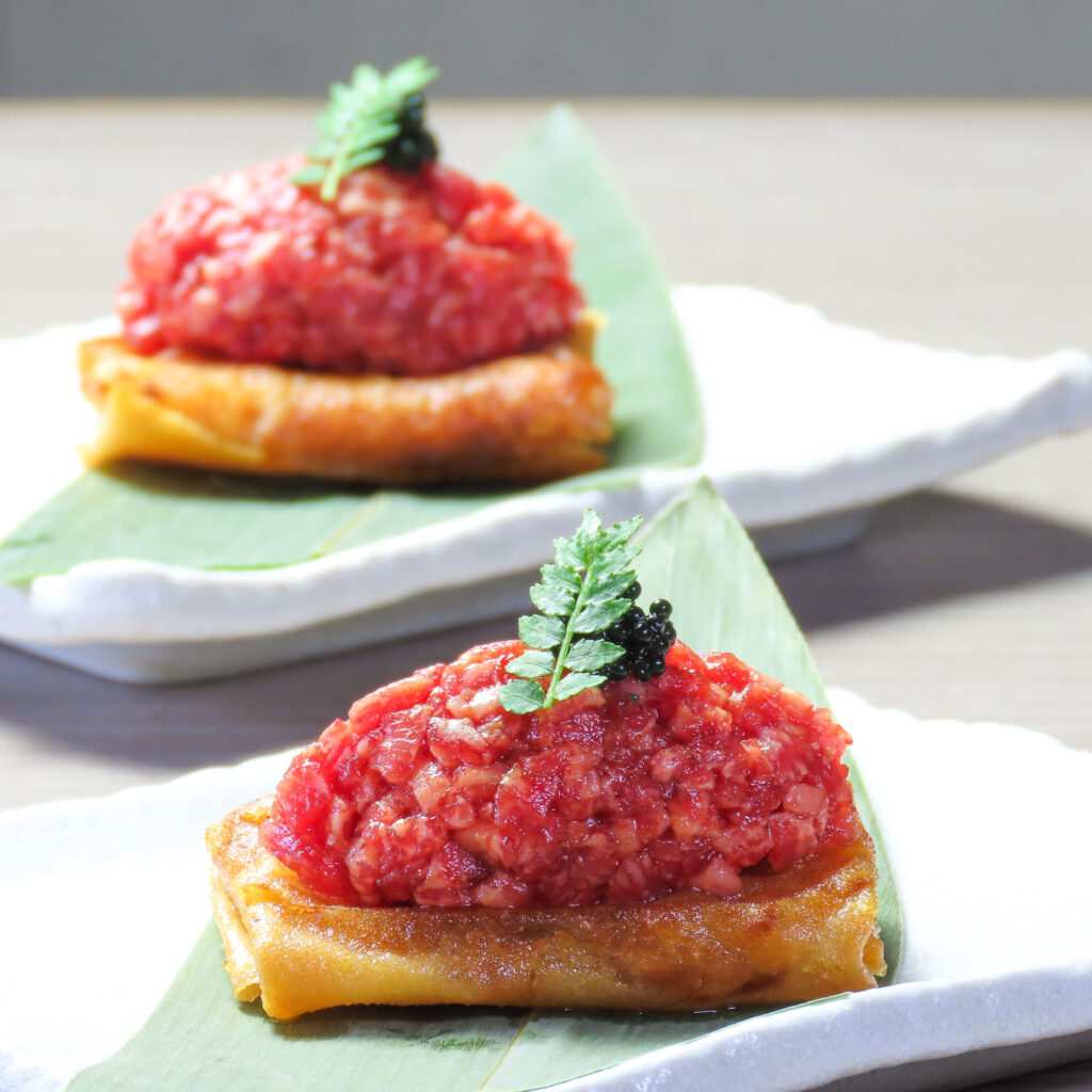 桜エビの香る春巻きと名物のユッケを一緒に楽しめる逸品。サクトロの春巻きとねっとりとしたユッケの旨味を楽しめます。